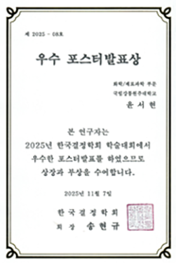 화학과 무기나노재료화학연구실(지도교수 이은지) 소속 윤서현 박사과정생이 지난 11월 6일(목)부터 7일(금)까지 강릉 스카이베이호텔에서 개최된 ‘2025년 한국결정학회 정기학술대회’에서 우수포스터발표상을 수상했다.