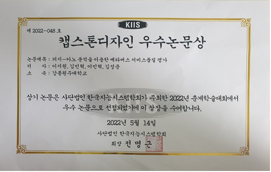 지난 5월 14일(토) 국립 한경대학교에서 열린 한국지능시스템학회 2022 춘계학술대회에서 과학기술대학 산업공학과(지도교수 김성준) 석사과정 이지원 대학원생과
