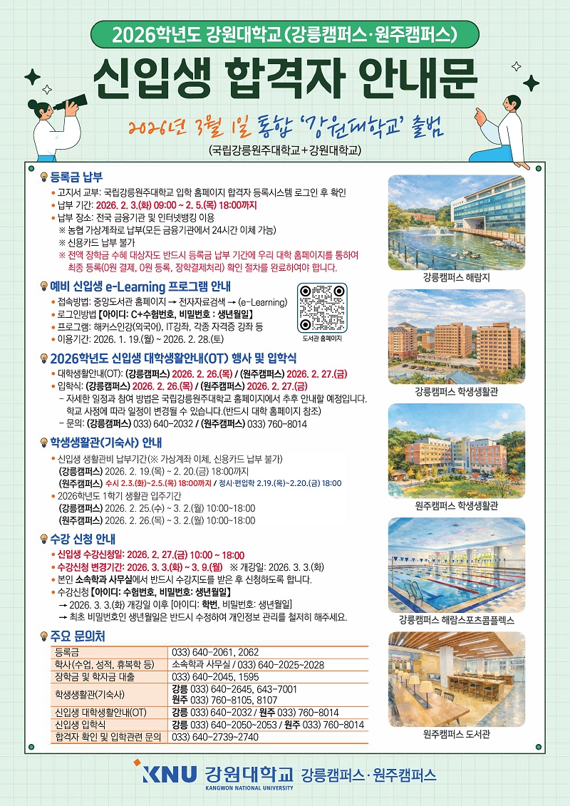 2026학년도 강원대학교(강릉·원주캠퍼스) 신입생 합격자 안내문