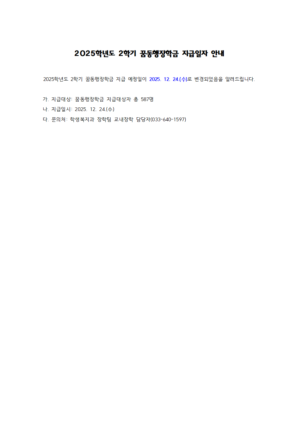 2025학년도 2학기 꿈동행장학금 지급일자 안내