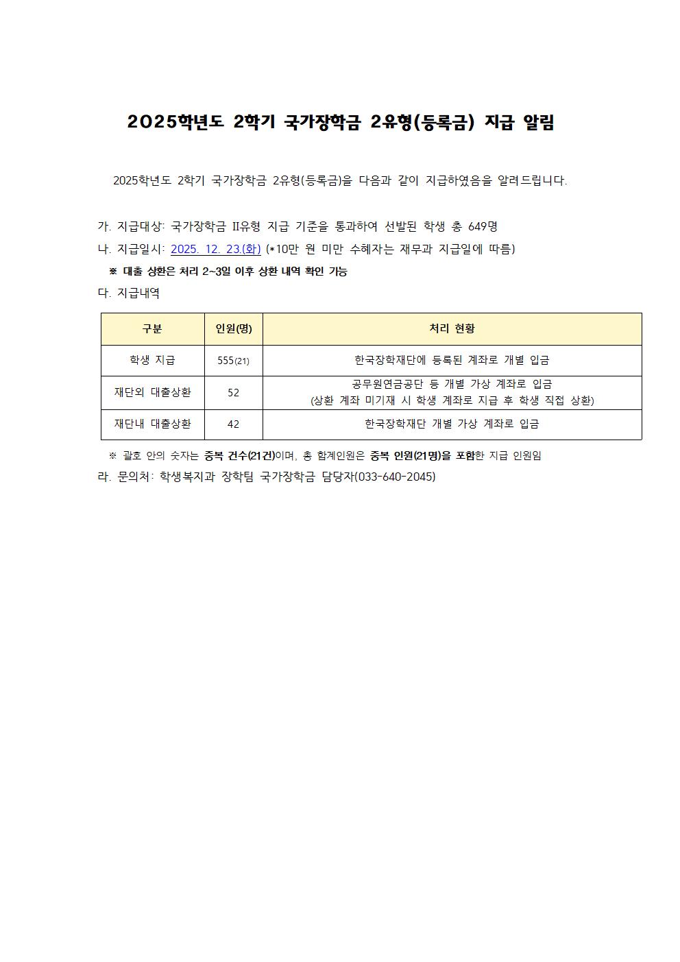 2025학년도 2학기 국가장학금 2유형(등록금) 지급 알림
