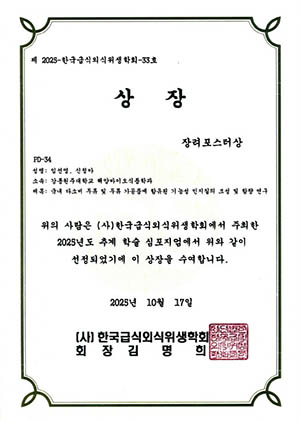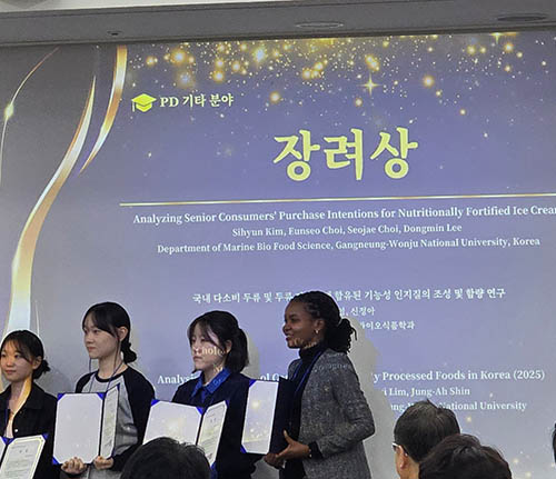 임선영 석사과정생은 「국내 다소비 두류 및 두류 가공품에 함유된 기능성 인지질의 조성 및 함량 연구」를주제로 연구 결과를 발표하였으며, NiyomubyeyiMarie Faustine석사과정생은 「Analysis of Cholesterol Content in Commonly Processed Foods in Korea (2025)」를 주제로 우수한 연구 성과를 인정받았다.