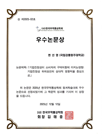 변선영 교수는 “기업의 진정성이 단순한 이미지 차원을 넘어 실제 소비자의 행동에 어떠한 영향을 미치는지를 실증적으로 규명하고자 했다”며, “이번 수상을 계기로 강원지역 기업을 중심으로 한 관련 연구를 더욱 확장해 나갈 계획”이라고 소감을 밝혔다.