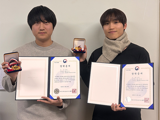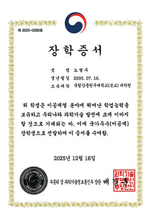 스마트인프라방재학과(주임교수 염상국) 석사과정에 재학 중인 노형주, 이준서 학생이 한국장학재단에서 주관하는 ‘2025년 석사우수장학금(이공계)’ 장학생으로 선정됐다.