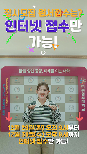 입학처는 대학 통합에 따른 명칭 변경과 정시모집 전형 등 주요 변경 사항을 수험생들에게 보다 쉽게 안내하기 위해, ‘강원대학교 강릉캠퍼스·원주캠퍼스’ 접수 방법과 정시모집 전형 내용을 담은 40~50초 분량의 숏츠(Shorts) 영상을 제작해 정시모집 기간 동안 적극 홍보하고 있다.