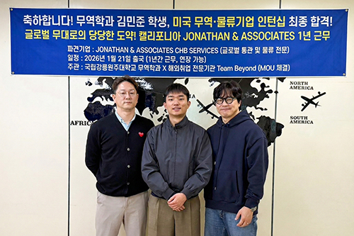 무역학과 3학년 김민준 학생은 본 프로그램을 통해 미국 무역·물류기업 인턴십에 최종 선발되었으며, 오는 1월 21일 미국으로 출국해 1년간 현지 기업에서 근무하며 현장 중심의 실무 역량을 축적할 예정이다.