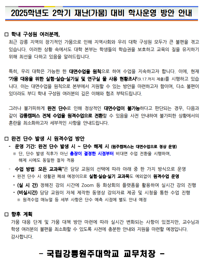 [학사] 2025학년도 2학기 재난(가뭄) 대비 학사운영 방안 안내