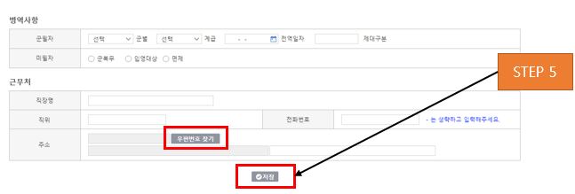 원서접수페이지에서 지원자 정보를 입력하고 하단의 저장 버튼을 클릭하여 제출합니다.