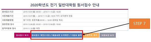 원서접수 화면에서 [원서접수 확인(수정) / 제출서류 도착확인 / 수험표출력] 버튼을 클릭합니다.