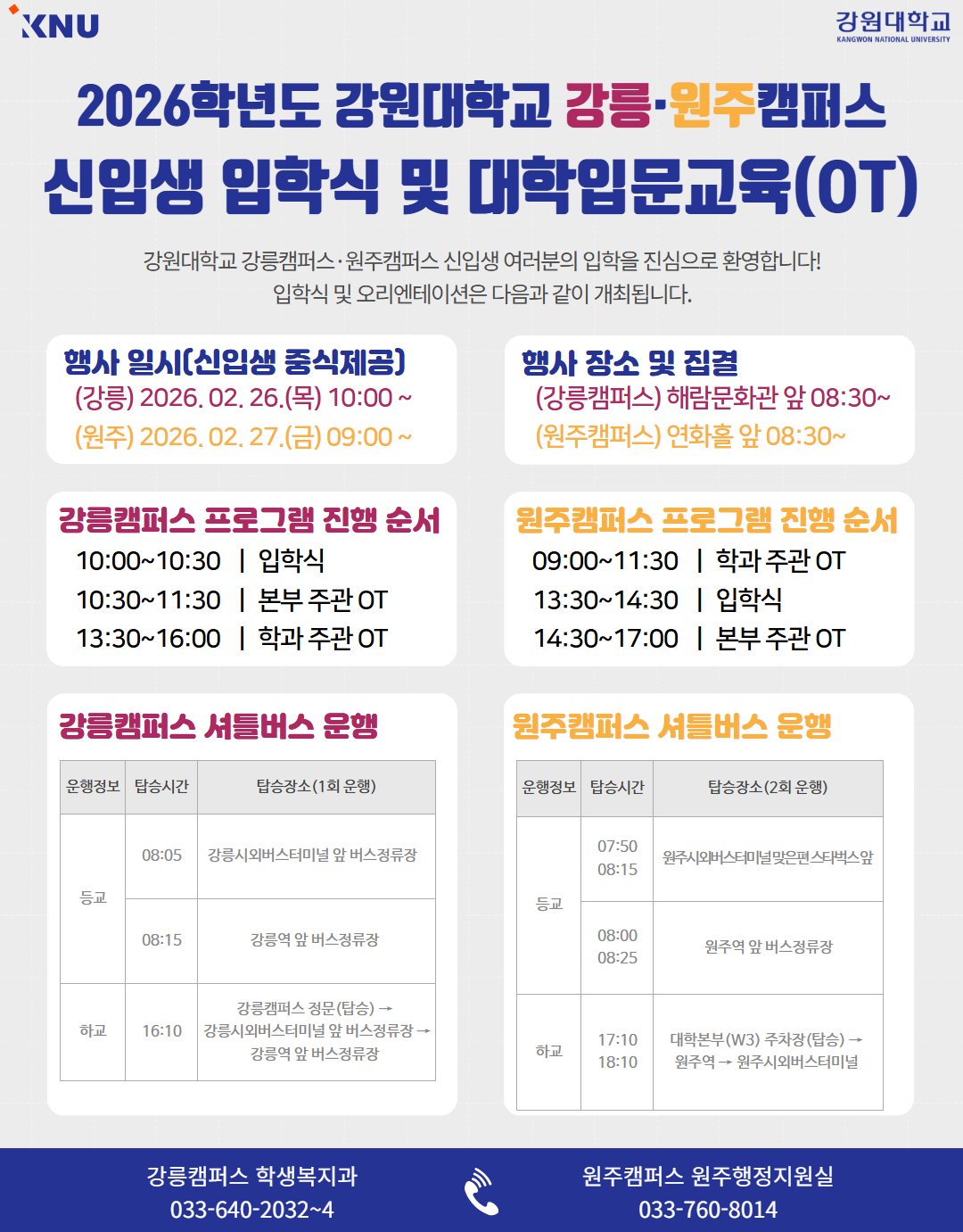 fnctId=bbs,fnctNo=1606 2026학년도 강원대학교 강릉·원주캠퍼스 신입생 입학식 및 대학입문교육(OT) 안내 분류 기타 작성일 2026.02.10 작성자 문준명 조회수 2601 첨부파일 2026학년도 입학식 및 대학입문교육(OT) 안내.pdf