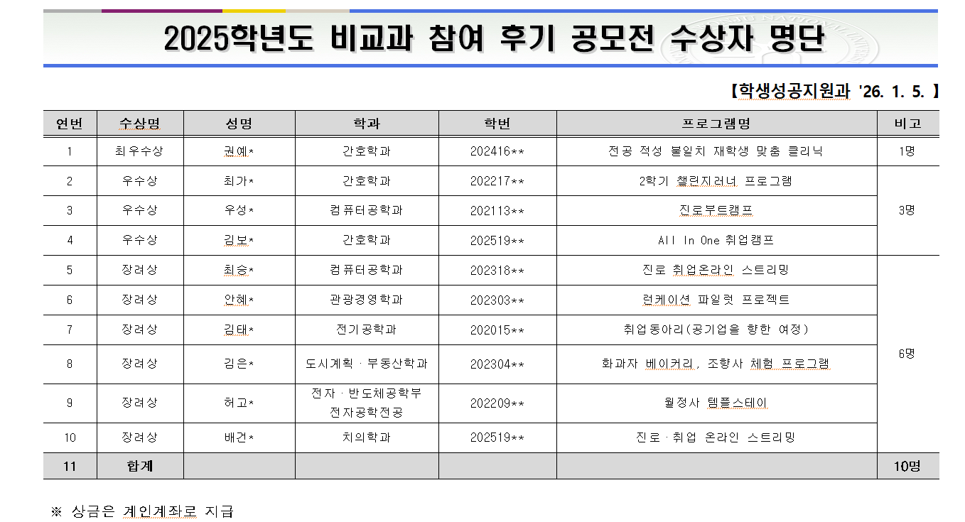 [공모전선정결과] 2025-비교과 참여 후기 공모전 수상자 발표