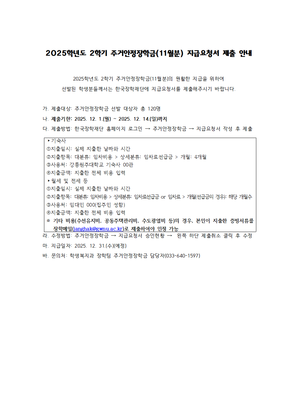 2025학년도 2학기 주거안정장학금(11월분) 지급요청서 제출 안내
