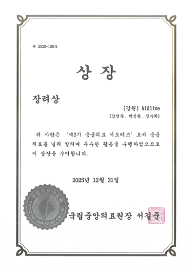 간호학과 김연주·박신원·정수희 학생, 국립중앙의료원 응급의료 서포터즈 장려상(국립중앙의료원장상) 수상