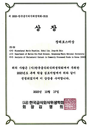 임선영 석사과정생은 「국내 다소비 두류 및 두류 가공품에 함유된 기능성 인지질의 조성 및 함량 연구」를주제로 연구 결과를 발표하였으며, NiyomubyeyiMarie Faustine석사과정생은 「Analysis of Cholesterol Content in Commonly Processed Foods in Korea (2025)」를 주제로 우수한 연구 성과를 인정받았다.