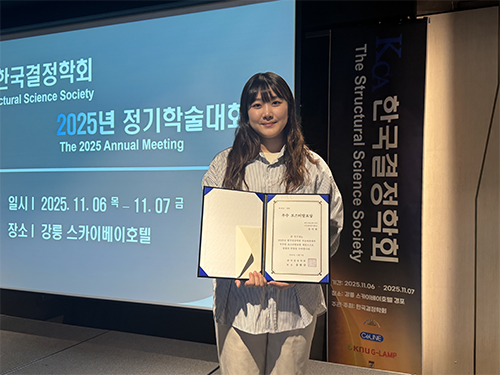 화학과 무기나노재료화학연구실(지도교수 이은지) 소속 윤서현 박사과정생이 지난 11월 6일(목)부터 7일(금)까지 강릉 스카이베이호텔에서 개최된 ‘2025년 한국결정학회 정기학술대회’에서 우수포스터발표상을 수상했다.