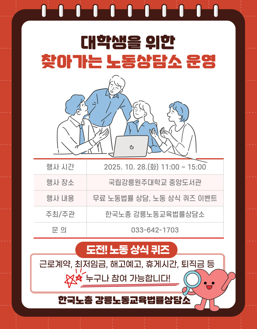 [학생] [강릉] [한국노총 강릉노동교육법률상담소] 대학생을 위한 찾아가는 노동상담소 안내(2025. 10. 28.)