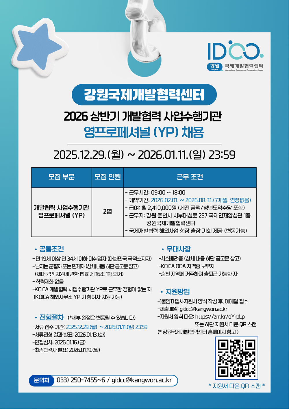 강원국제개발협력센터에서는 다음과 같이 2026 상반기 개발협력 영프로페셔널(Young Professional)을 모집합니다.