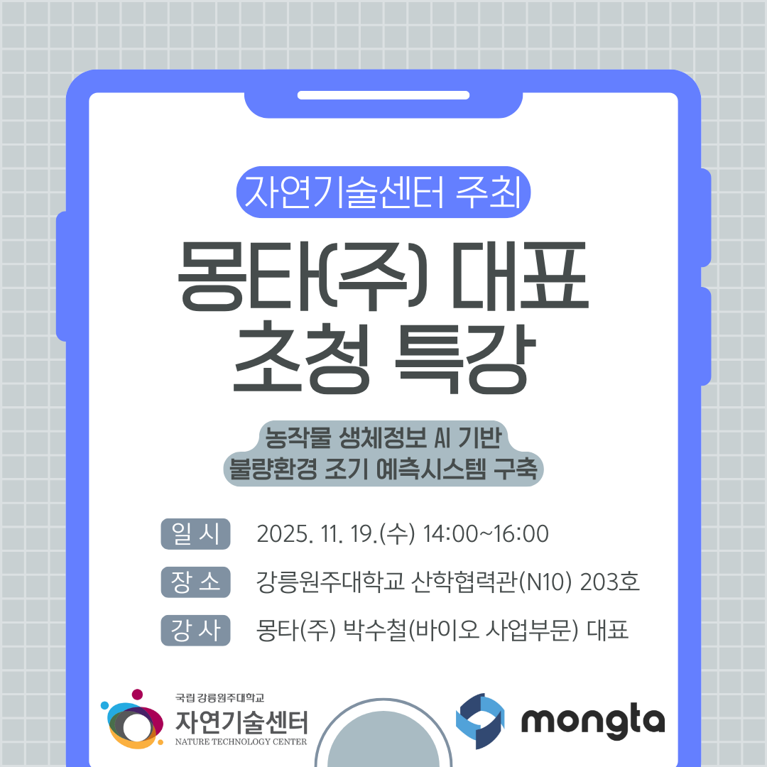 fnctId=bbs,fnctNo=1769 자연기술센터 주최 몽타(주) 대표 초청 특강 안내 작성일 2025.11.13 작성자 전경진 조회수 172 첨부파일 첨부파일이(가) 없습니다.